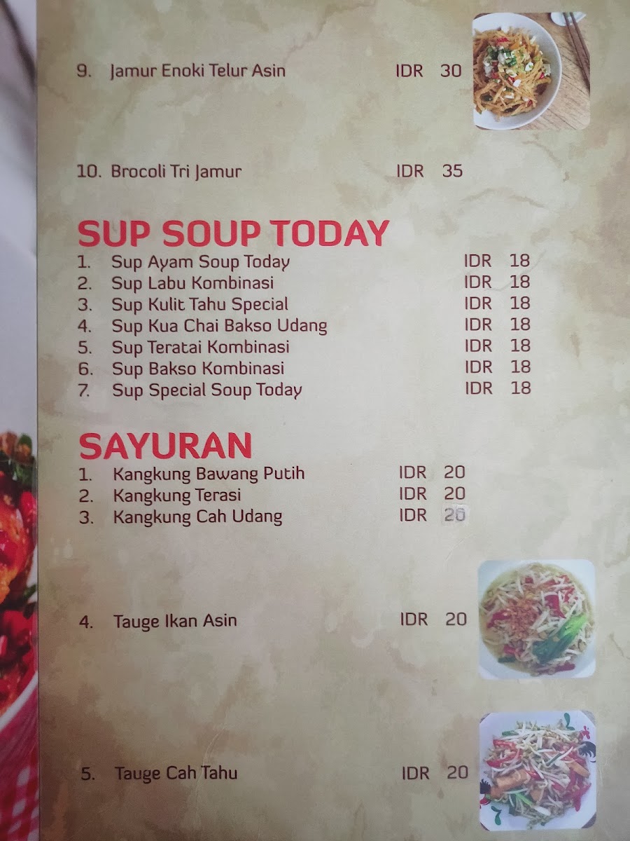 Welcome to SOUP TODAY, a delightful culinary retreat located at 02, Jl. Pangeran Diponegoro No.9, Medan Polonia, Indonesia. This charming eatery captures the essence of home-cooked meals, offering a warm atmosphere that invites you to linger. Customers rave about the authenticity and flavors of dishes like nasi goreng, terong bakar madu, and ayam tim, each crafted with care. The standout kopi arang is a must-try, served uniquely on a traditional clay stove, delivering a rich coffee experience at an affordable price.